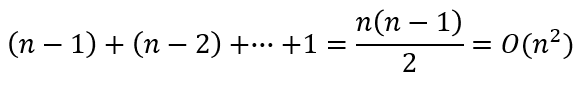먼저 비교횟수를 구하기 위하여 두 개의 for 로프의 실행횟수를 계산해보자. 외부 루프는 n-1번 반복한다. 내부 루프는 0에서 n-2까지 변하는 i에 대하여 (n-1)-i번 반복한다. 키값들의 비교가 내부 루프 안에서 이루어지므로 전체 비교횟수는 다음과 같이 된다.