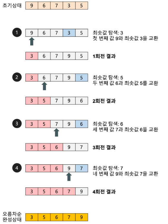 위 설명에서는 두 개의 리스트로 나누어 설명했지만 실제로 선택 정렬을 구현하기 위해 두 개의 배열을 사용할 필요는 없다. 아래 그림과 같이 정렬이 안 된 리스트에서 최솟값이 선택되면 이 값을 배열의 첫 번째 요소과 교환한다. 이렇게 입력 배열 이외에 다른 추가 메모리를 요구하지 않는 정렬 방법을 제자리 정렬(in-place sorting)이라고 한다. 최솟값 1과 첫 번째 요소 5를 교환하면 전체 배열은 정렬된 부분과 되지 않은 부분으로 나뉜다. 다음에는 두 번째 요소부터 나머지 요소들 중에서 가장 작은 값을 선택하고 이를 두 번째 요소와 교환한다. 이 절차를 (숫자 개수 - 1)만큼 되풀이하면 추가적인 배열을 사용하지 않고서도 전체 숫자들이 정렬된다.